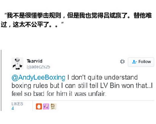 中国队选手吕斌与35岁肯亚老将彼特(Peter Mungai Warui)激战3回合,吕斌在最后回合发挥出色,等待比赛结果时,脸上也信心满满的期待着胜利,还一路挥手欢呼,当裁判宣佈结果时更即时高举右手,似乎以为自己获胜,但岂料裁判是举起彼特的手,宣佈彼特胜出,吕斌瞬间吓呆,本来高举的手也停在半空,最后仅能错愕地接受对手拥抱,场面相当尴尬,场边的教练也只能苦笑。