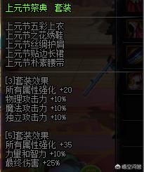 上元节套装属性也是一个小加强,原来的五件套提升35点全属强,在改版后提升至40点,虽然只是5点的加成,但是也很重要了;力量与智力从10%提升至12%;但是竟然把最终伤害由25%降低至20%,这个降低我想不通。