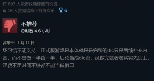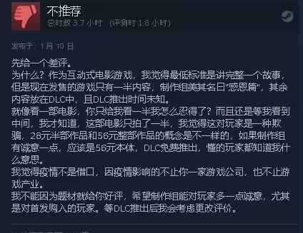 遗憾的是,游戏的正式版本并没有把整个故事讲完,游戏的下半部分会将会以DLC的形式推出,但这样玩到一半就结束的售卖方式难免会让玩家们失望。