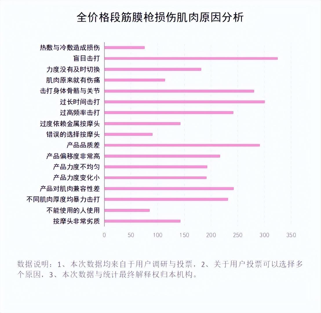 以上就是筋膜枪的危害和副作用,但是大家知道究竟是什么原因引起的这些危害吗?导致筋膜枪危害的真正原因是什么?下面我就借助专业机构发布的筋膜枪肌肉损伤原因统计图,来分析一下是那些原因导致筋膜枪损伤肌肉。