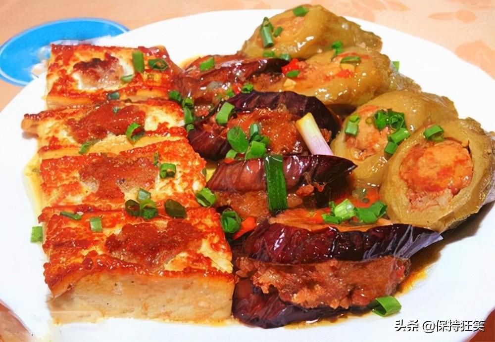 煎酿三宝是广东、香港和澳门地区的常见的粤式街头小吃,又是一种香港传统小吃。这种小吃过去大多让顾客以“七蚊三件”或“十蚊四件”,从一堆煎酿食物里挑选三件,其中又以茄子、青椒和豆腐最受欢迎。这种小吃的做法是把新鲜打做的鲮鱼肉酿在切件的茄子、青椒和豆卜这三种食品或其他较为少见的食物上,放在铁板上煎香,再蘸上豉油吃,喜欢吃辣的可加点辣椒油;有时亦会使用竹签串著,像吃鱼蛋一样。