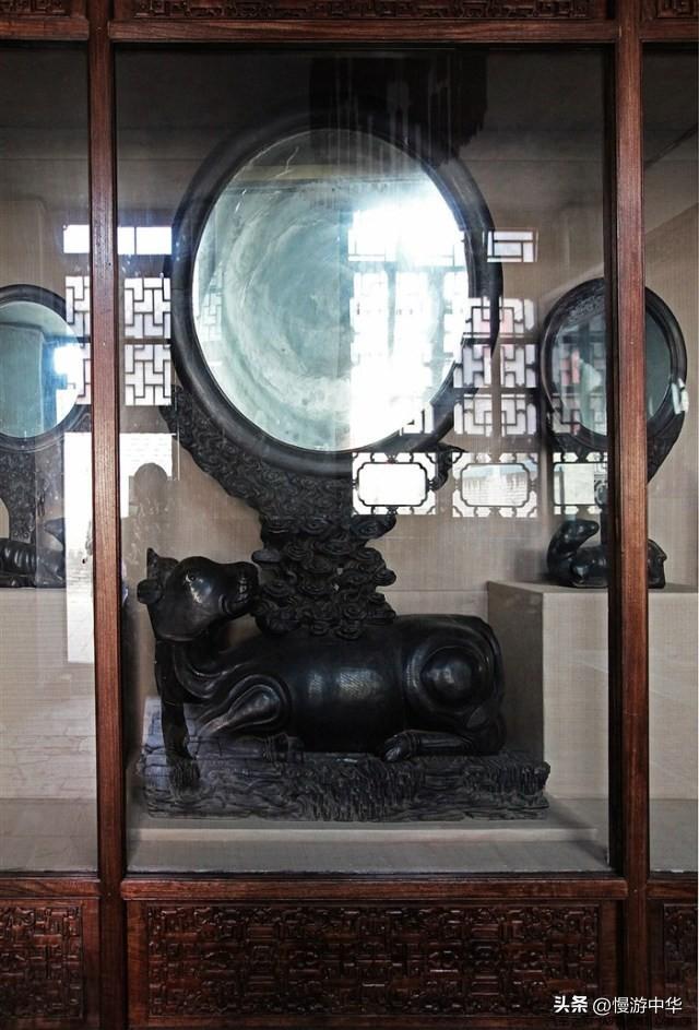 乔家大院中还有一件非常有名的宝贝,那就是犀牛望月镜。它高两米重一吨,采用东南亚的铁梨木雕刻而成,是国家的一级文物,同时也是乔家的镇宅之宝,整个宝贝由三部分组成,上面是镜子代表圆圆的月亮,中间是祥云,底座是犀牛,因此叫"犀牛望月镜"。