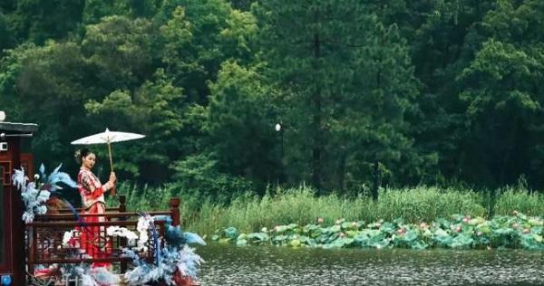 山葱水秀里,一艘古色古香的画舫向众亲友缓缓驶来,天地为证,山水为媒,这样的景致像极了这长长久久的爱情。