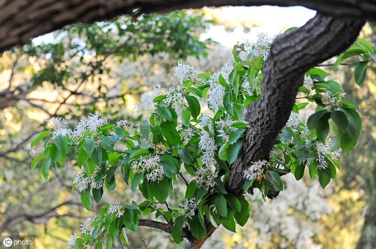 流苏树又称流疏树、茶叶树、四月雪。流苏树属于落叶大灌木或小乔木,高可达20m,树干灰色,细碎块薄片爆裂。大枝皮常纸状剥裂,开展,小枝幼时有短柔毛。单叶对生,叶卵形至倒卵状椭圆形,全缘或有时有小齿。圆锥花序大而松散,生侧枝顶端,雌雄异株;花白色,花冠合生,先端裂成4片,宽线形下垂。花期4月〜5月,微有香气。核果卵圆形,暗蓝黑色,初秋成熟。