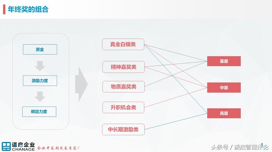同时,也要注意到,对企业中的不同人才来说,他们对年终奖的需求和期望是不一样的。比如对于基层员工来说,通常实实在在能拿到手的金钱或者物资才是最有用的,同时精神嘉奖也可以起到不错的效果。对于确实表现优秀的中层干部,年末给到升值的机会无疑是非常大的激励。而对于公司高层来说,需要给真金白银,同时也要考虑中长期的收益。对高层实施中长期激励类的年终奖,一方面在公司发展良好的情况下可以给高层带来更高的收益,一方面也是将高层与公司进行进一步捆绑,使高层进一步对公司业绩负责,与公司共同进退。