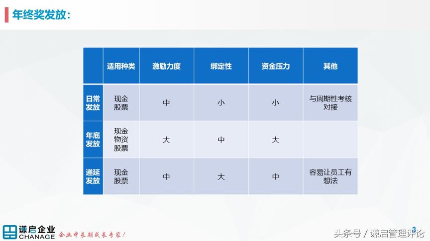 在确定了年终奖的发放内容后,就要考虑应该如何发放了:是在年终爽快地一次性发完?还是分几批、半年发一次或季度甚至月度发放?或者为了起到留人和规避风险的效果,部分或全部年终奖递延发放?
