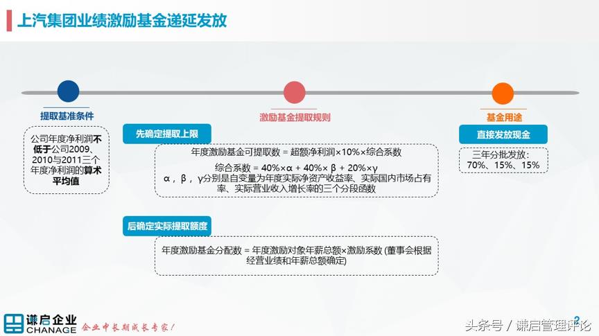 比如上汽集团在2012至2015年就实施过业绩激励基金递延发放计划:公司董事会根据2012-2015各年度净利润的完成情况,在年度激励基金可提取数的额度内,结合年度激励对象年薪总额,分别确定年度激励基金。年度激励基金根据激励对象绩效评价结果分配后,在该年度之后三年内分三次发放,第一年发放70%,之后两年分别发放15%。且设置了年度激励基金的提取条件:年度净利润不低于公司2009、2010与2011三个年度净利润的算术平均值。