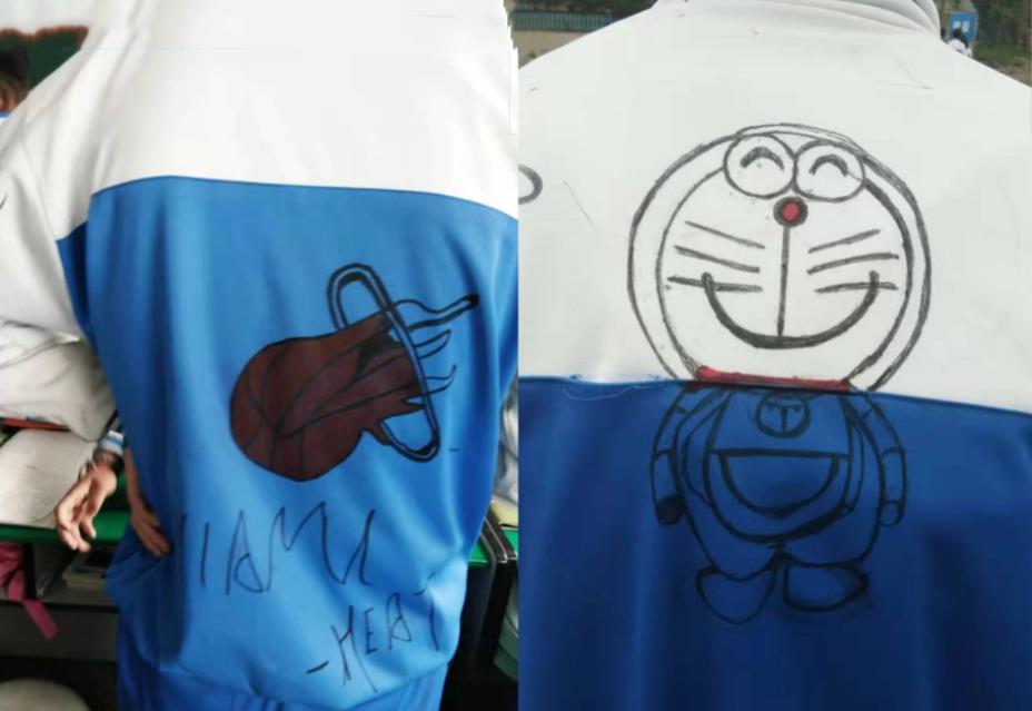 正如这位同学的画作,将多啦A梦画在了校服上,而且画的还挺好看的,另一位同学将篮球画在校服上,可见这位学生对于篮球的热爱。