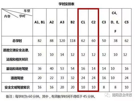 C1证的总学时为62学时,每学时为60分钟,其中有效教学时间不得低于45分钟。每个学员课堂学习时间和实际操作时间每天均不得超过4学时。