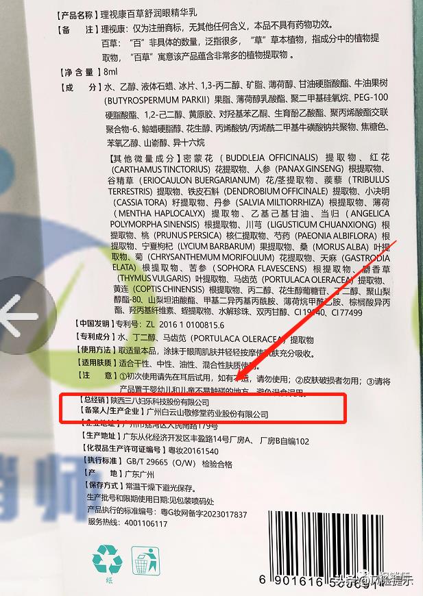 在理视康百草舒润眼精华乳产品外包装上,在其包装显著位置标有“38Fule”的品牌logo,经企查查APP可以得知“38Fule”商标申请人为陕西三八妇乐科技股份有限公司于2017年注册;另据包装盒背面显示该产品总经销为陕西三八妇乐科技股份有限公司。