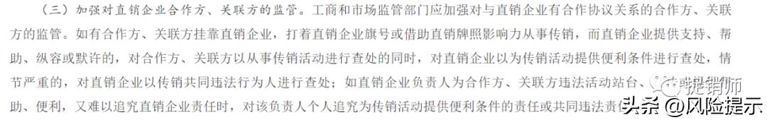 2018年国家市场监督管理总局发布《关于进一步加强直销监督管理工作的意见》中明确指出:工商和市场监管部门应加强对与直销企业有合作协议关系的合作方、关联方的监管。如有合作方、关联方挂靠直销企业,打着直销企业旗号或借助直销牌照影响力从事传销,而直销企业提供支持、帮助、纵容或默许的,对合作方、关联方以从事传销活动进行查处的同时,对直销企业以为传销活动提供便利条件进行查处,情节严重的,对直销企业以传销共同违法行为人进行查处;如直销企业负责人为合作方、关联方违法活动站台、宣传或提供帮助、便利,又难以追究直销企业责任时,对该负责人个人追究为传销活动提供便利条件的责任或共同违法责任。