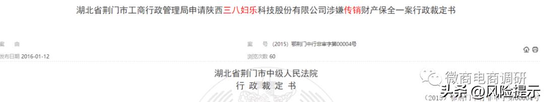 在中国裁判文书网上,也存在三八妇乐因涉嫌传销被有关监管部门冻结账户的记录。2015年9月,据《湖北省荆门市工商行政管理局申请陕西三八妇乐科技股份有限公司涉嫌传销财产保全一案行政裁定书》显示,申请人湖北省荆门市工商行政管理局在查处被申请人陕西三八妇乐科技股份有限公司涉嫌传销一案中,为防止被申请人转移或隐匿违法资金,向法院提出申请,请求对被申请人的账户予以冻结。经审查,湖北省荆门市中级人民法院裁定如下:1、冻结被申请人陕西三八妇乐科技股份有限公司在金融机构及第三方支付平台的资金账户;2、冻结被申请人利用金融机构及第三方支付平台转移的资金账户。