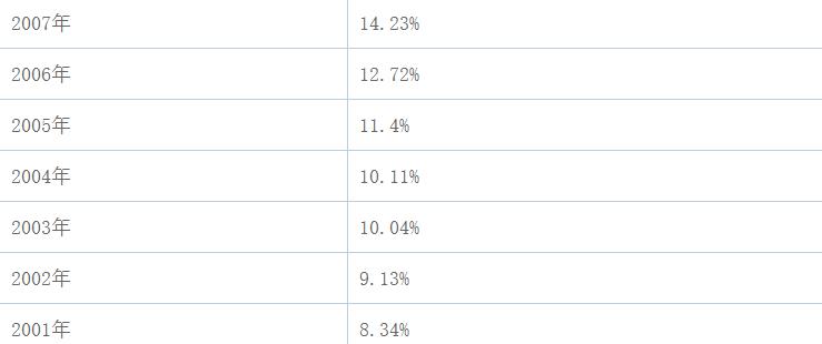 中国GDP总量每年赶超一个西方发达国家,中国经济的高速增长令全球瞩目。据统计数据显示,2003年至2007年,中国GDP年度增长率均高达10%以上,平均年增长率高达11.7%,尤其是在2005年2007年,年度增长率分别达到:11.4%、12.7%、14.2%,平均增长率高达12.7%,可见当时中国经济发展有多快。