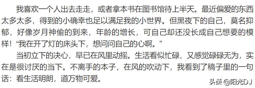 来日方长,未来可期。孤独,或许就是成长的必经之路吧。一个人,也可以看点点繁星,独占图书馆的一角。在夜深人静时,听着歌写写文字。至少,关于我们的明天,还是个未知的礼物。我想:属于自己的谎话,它在心里早已慢慢长大,成为保护那颗动摇的心的双手,它会为我打开生活的明朗,它会带我寻找万物的可爱,以及,我回家的路。