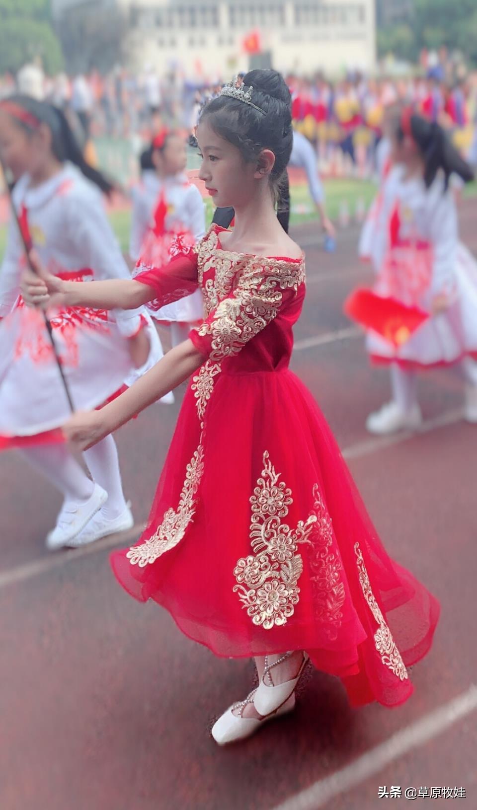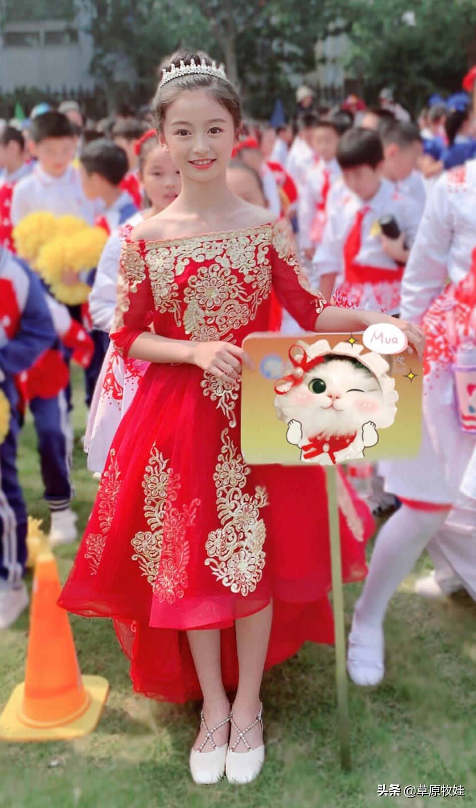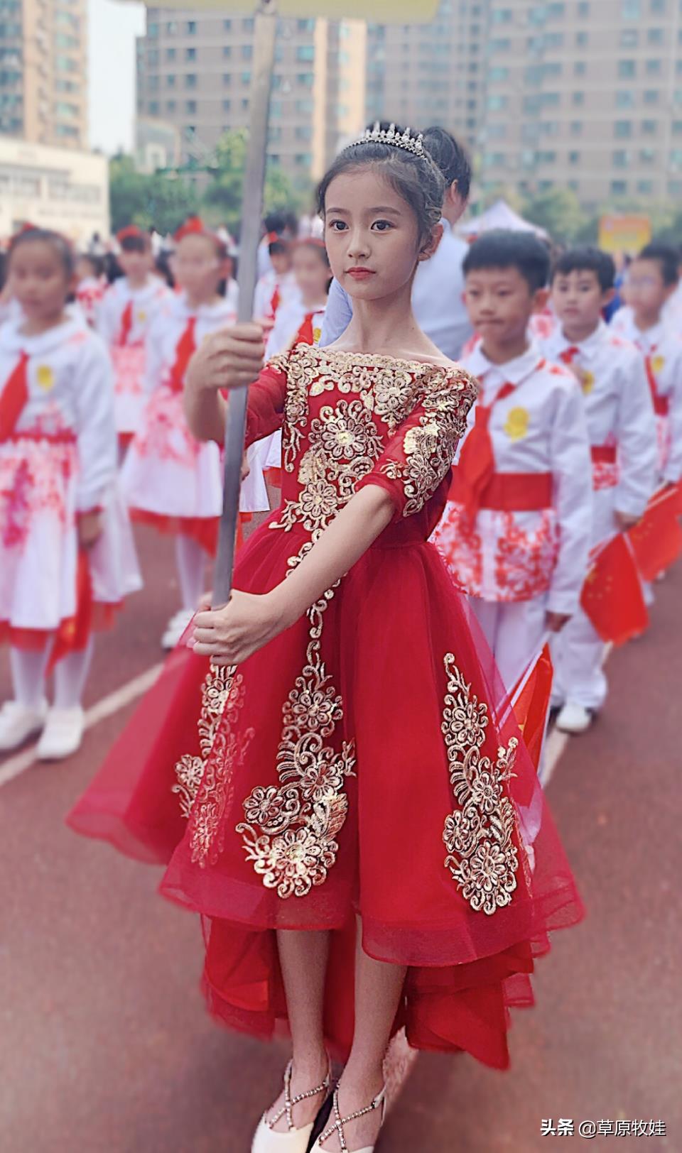 童模裴佳欣怕和同学撞衫,所以这次在参加校运会的时候,裴佳欣就穿上了一款像是由自己设计而成的婚纱。红色婚纱,光是从视觉上看过去就已经很吸睛了,裴佳欣用镶嵌着钻石的皇冠与它搭配后,就越发的能把这种效果给穿出来。