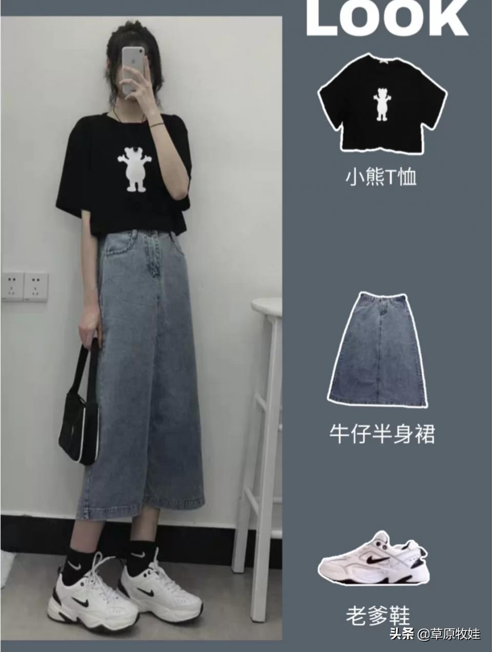 包含了小熊图案做以装饰的黑色T恤,能够尽显穿着者的俏皮感,而且也会让人觉得T恤不再单调;有着高腰设计的牛仔半身裙,是烟灰的颜色,它与黑色T恤搭配后,就有着异曲同工之妙。