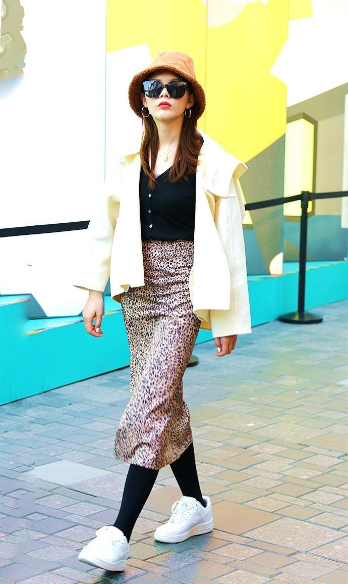 1.豹纹元素是时尚界的经典,自从豹纹图案问世以来,一直长盛不衰,并且被发展演绎为更多样式,对服饰的装点起了很大作用。豹纹的含义也很丰富,从对自然界的保护到都市人的内心表达,再到对人类情感和心理的呵护,都涉及到了。穿好豹纹并不简单,但是,走心的美女,依然能巧用豹纹,获得不错的搭配效果。今天,我们就来看看,这些美女怎样用自己的实践表明,搭配豹纹不像想象的那么难。这个美女,选择豹纹长裙,上装搭配黑色针织V领小衫,外套一件奶油色披肩领短外套。美女头上戴一顶杏黄色的花盆帽。这样一套整体搭配