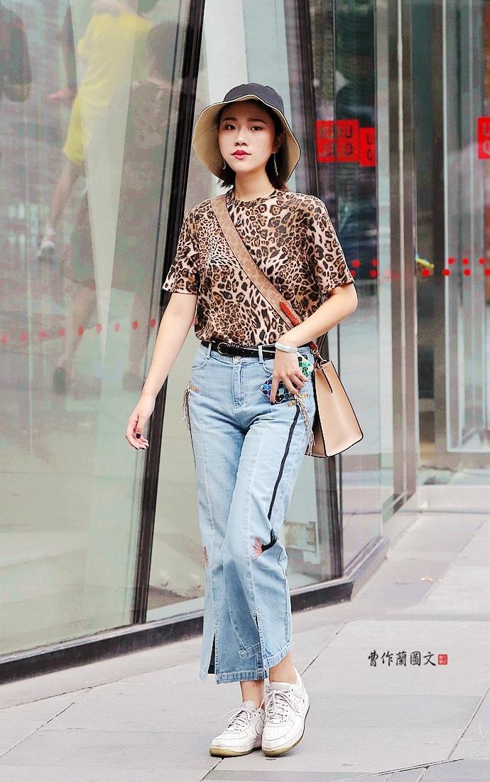 4.这个美女选择豹纹上衣,这个上衣很简单,只是一件针织T恤衫。但是,美女的搭配很到位,所以,一件T恤的效果依然不可小觑。美女的下装是一条宽松款的牛仔裤,裤子上有少量破洞。美女脚穿白色运动鞋,头上佩戴一顶黑色与咔叽色拼配的双面渔夫帽。不仅搭配出了轻松闲逸的休闲风格,而且升华了豹纹T恤的穿着效果,在渔夫帽的衬托下,整体搭配韵味十足。