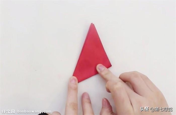 1、首先准备一张红色正方形彩纸,将彩纸沿斜角对折三次。