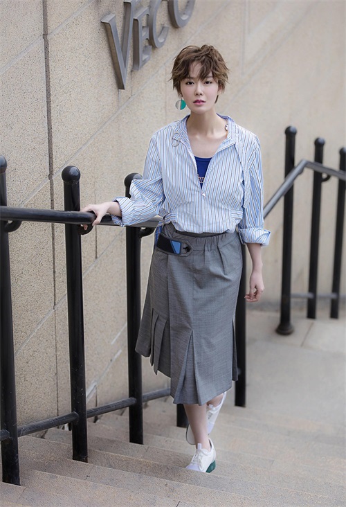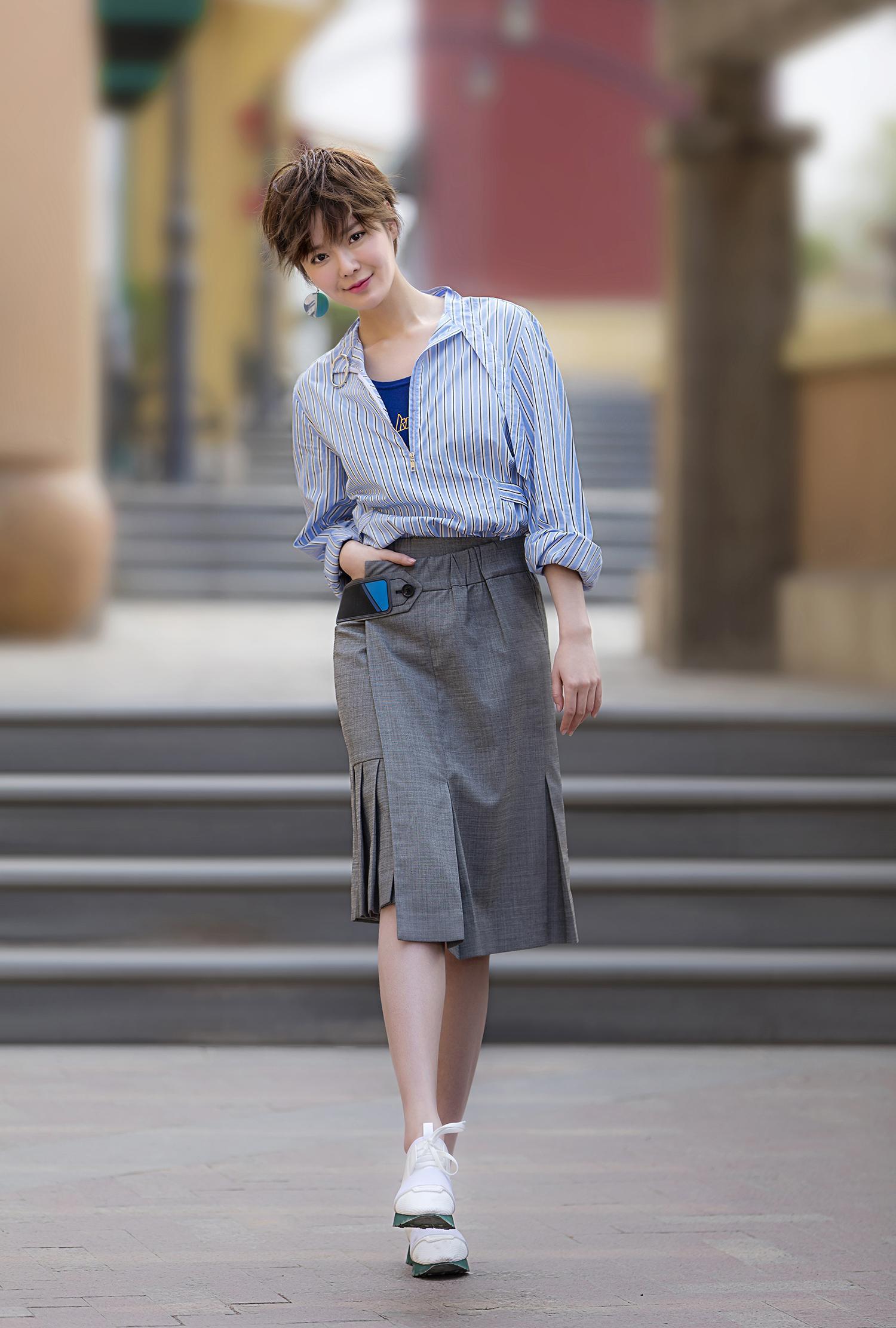 13日,刘海蓝在微博晒出一组街拍写真图,并配文“清爽,午后”。照片中,刘海蓝身穿条纹衬衫搭配灰色半身裙,脚踏小白鞋,在清爽的午后漫步街头。