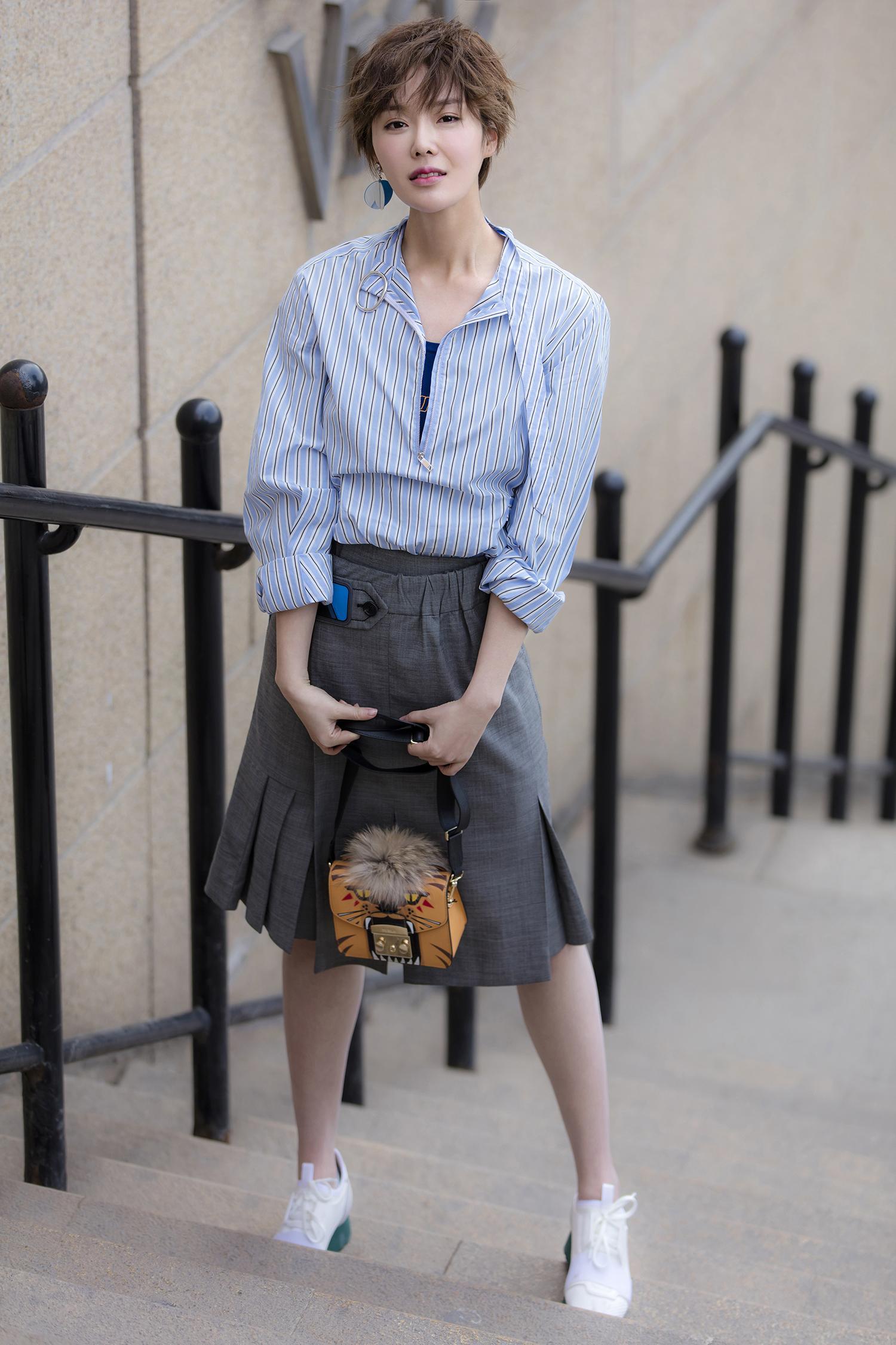 笑容恬淡,身材高挑修长的她,知性清新中又不乏潇洒干练,以蓝色墨镜搭亮片耳环加以点缀,更添时尚感。*