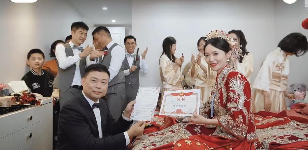 过了一会儿,常怡秋穿上了传统的中式礼服,戴着华丽的凤冠霞帔,迎接新郎的到来。