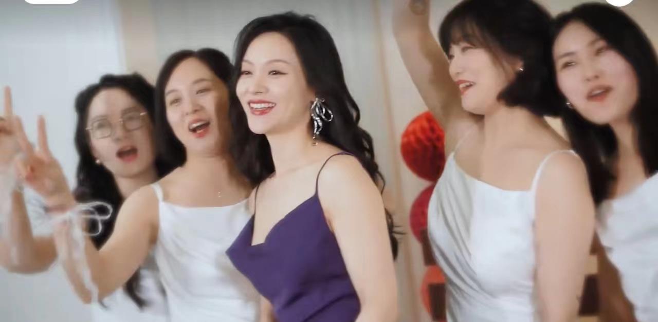 随后,她又穿上了一件紫色吊带连衣裙,涂上了精致的红唇浓妆,手捧鲜花,与伴娘们开心地拍摄合影。