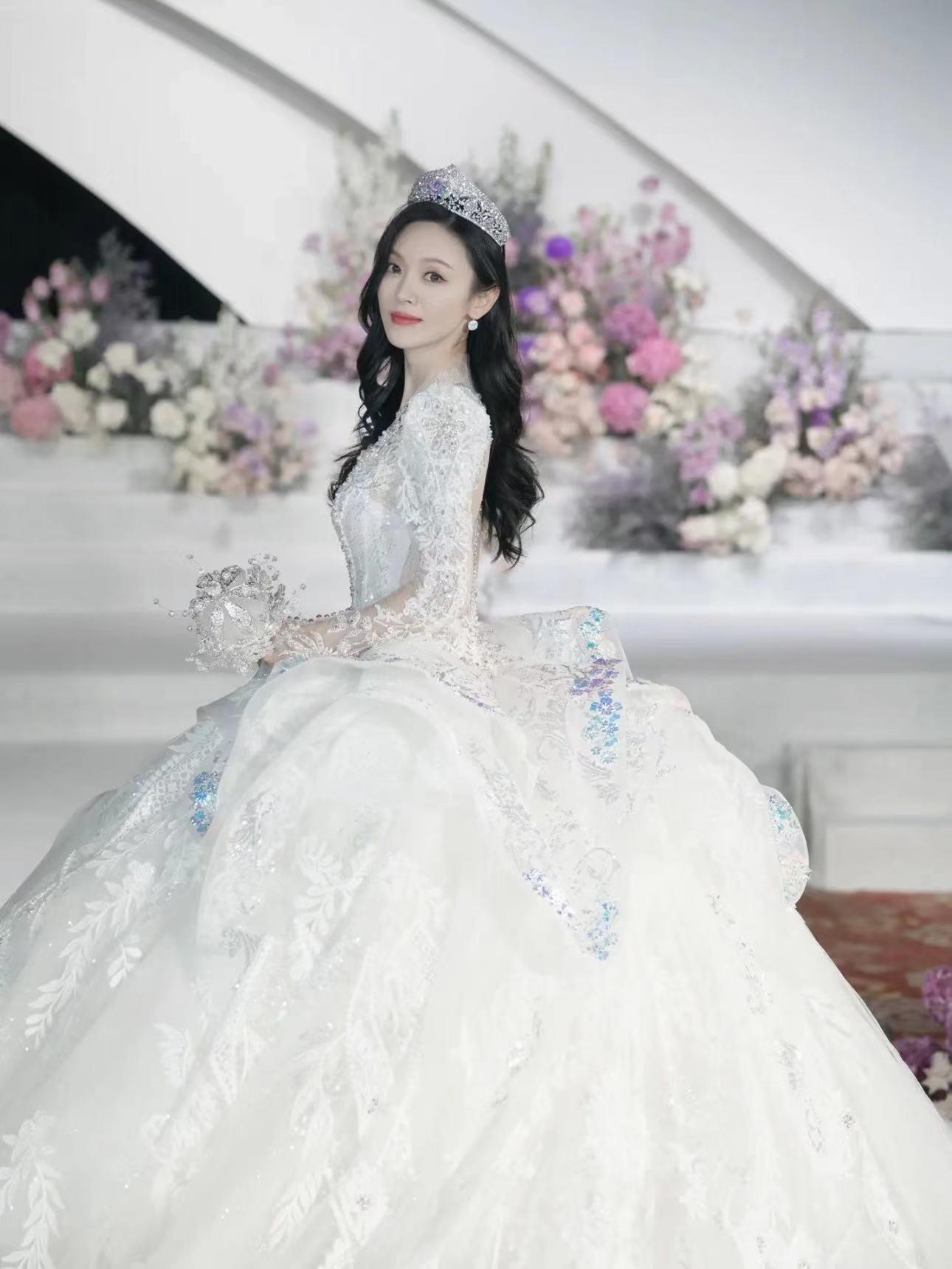 举行婚礼仪式时,常怡秋换上了一件奢华的宫廷风婚纱,上面满是精致的蕾丝,还缀满了闪耀的亮片水晶。戴上王冠的她,端庄、优雅,宛如女王般霸气又迷人。