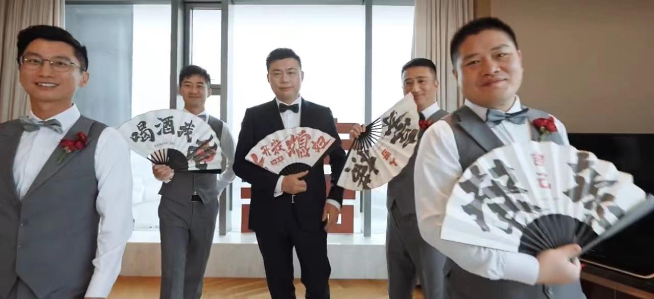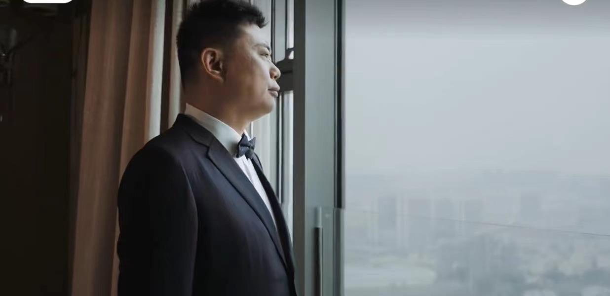 镜头中,新郎穿着合身的黑色西服套装,外形看上去有些成熟,某些角度竟然意外撞脸刘强东。