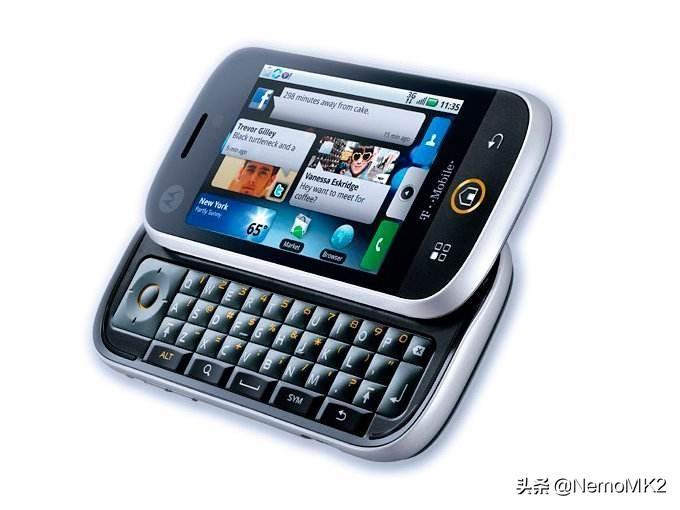 摩托罗拉CLIQ,ARM v6的指令集,512Mhz主频,256m RAM,可能唯一的亮点就是当时很是细腻的HVGA屏幕和这块侧滑全键盘了,侧滑后屏幕背后的不锈钢也是闪闪发亮。深夜,用这块键盘在QQ空间写篇长文,就感觉自己很帅。