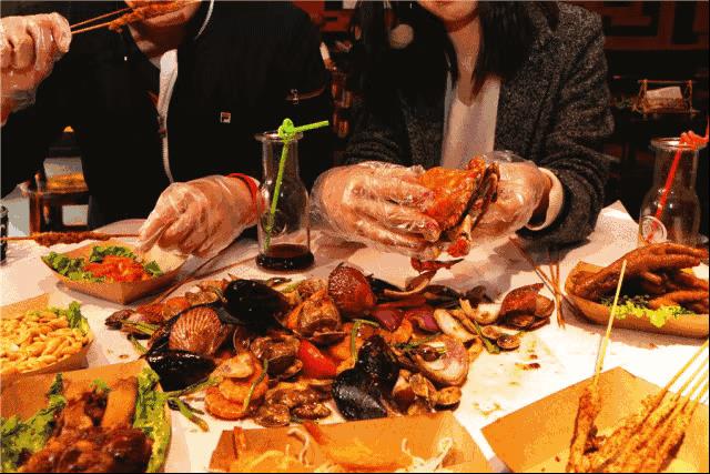 当一张长方形大桌子上,铺满了各种菜品的时候,也顾不得矜持,纷纷带着手套,想吃啥直接下手,找不到没关系的,划拉划拉使劲找找。就差跳进去打滚了。