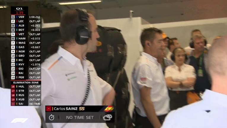 Q2最后时刻,赛道第二段出现了黄旗(吉奥维纳兹在8号弯失控打转引发的)。诺里斯冲线之后排名第11位,仅比第10的莱科宁慢了0.01秒;这样一来,迈凯伦两将均无缘Q3。