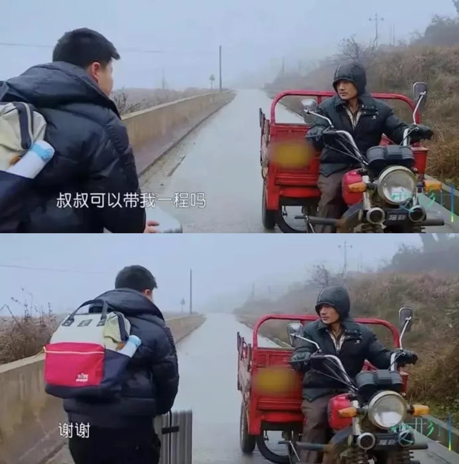 比如在需要步行进村的路上,看到一辆路过的三轮车,提出让对方带他一程,对方答应后,也很礼貌的说了谢谢。