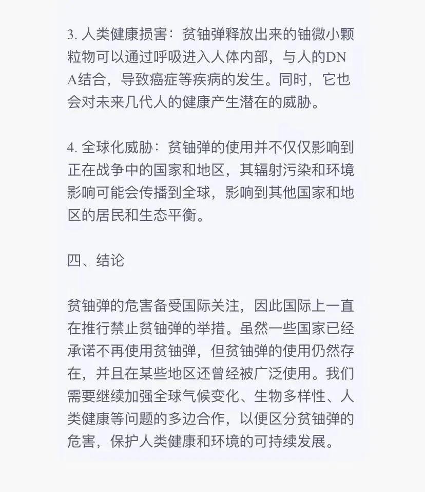 4.全球化威胁:贫铀弹的使用并不仅仅影响到正在战争中的国家和地区,其辐射污染和环境影响可能会传播到全球,影响到其他国家和地区的居民和生态平衡。