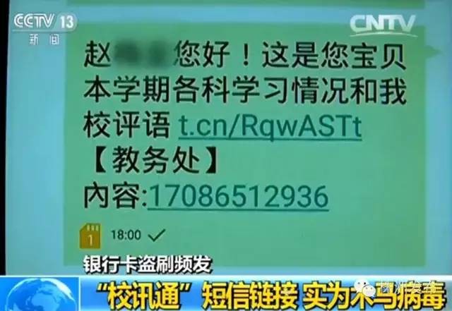 近日,央视《新闻30分》报道了一条新闻,不少地方出现一种新的盗刷银行卡的办法,叫做“校讯通”。很多孩子家长是收到一条短信提示,可通过链接查看孩子在校成绩、表现,结果点进去之后家长就中了招。新闻中说,广东中山的赵阿姨短短5分钟,被盗刷了1000元。而深圳的张先生点击了同样一个链接,损失更大了,一下子就被转走了12000元!