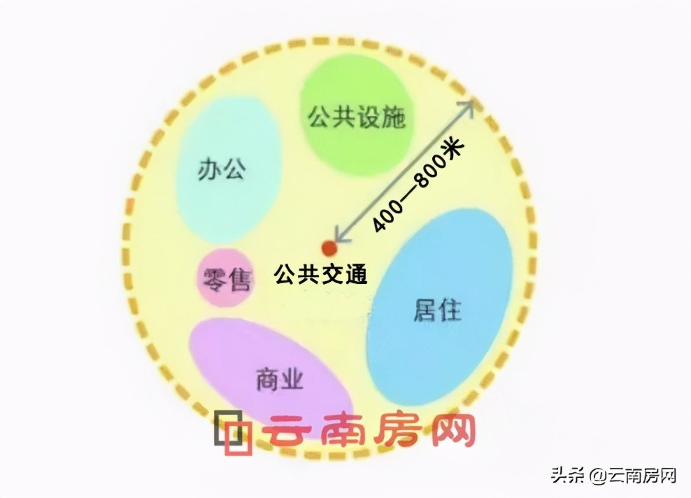 在TOD模式下,以公共交通为核心,400-800米(5-10分钟步行路程)为半径,将商业、办公、居住等功能集聚在一起,形成只用步行即可通达的生活圈。用八个字来概括即:衣食住行,靠脚就行。