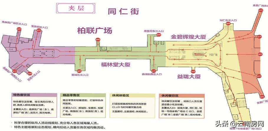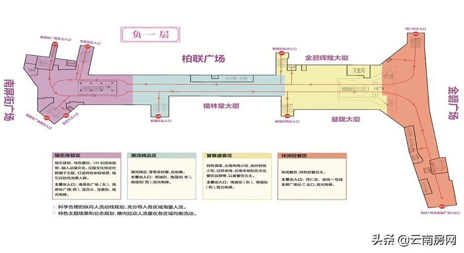 此外,地铁2、3、5、6号线也环伺周围,日均接驳数十万人流量,南屏茂共计17个地面到地下的出入口,串联起南屏街、正义路、顺城街、宝善街、南强街、金碧路等周边道路,连接、聚合了顺城、昆百大、柏联百盛等市中心各大商业体,实现了客流共享。