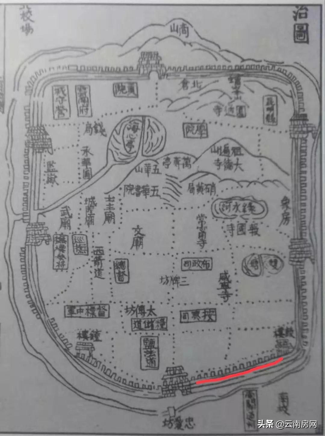 南屏街旧址为南城墙(图中红线)