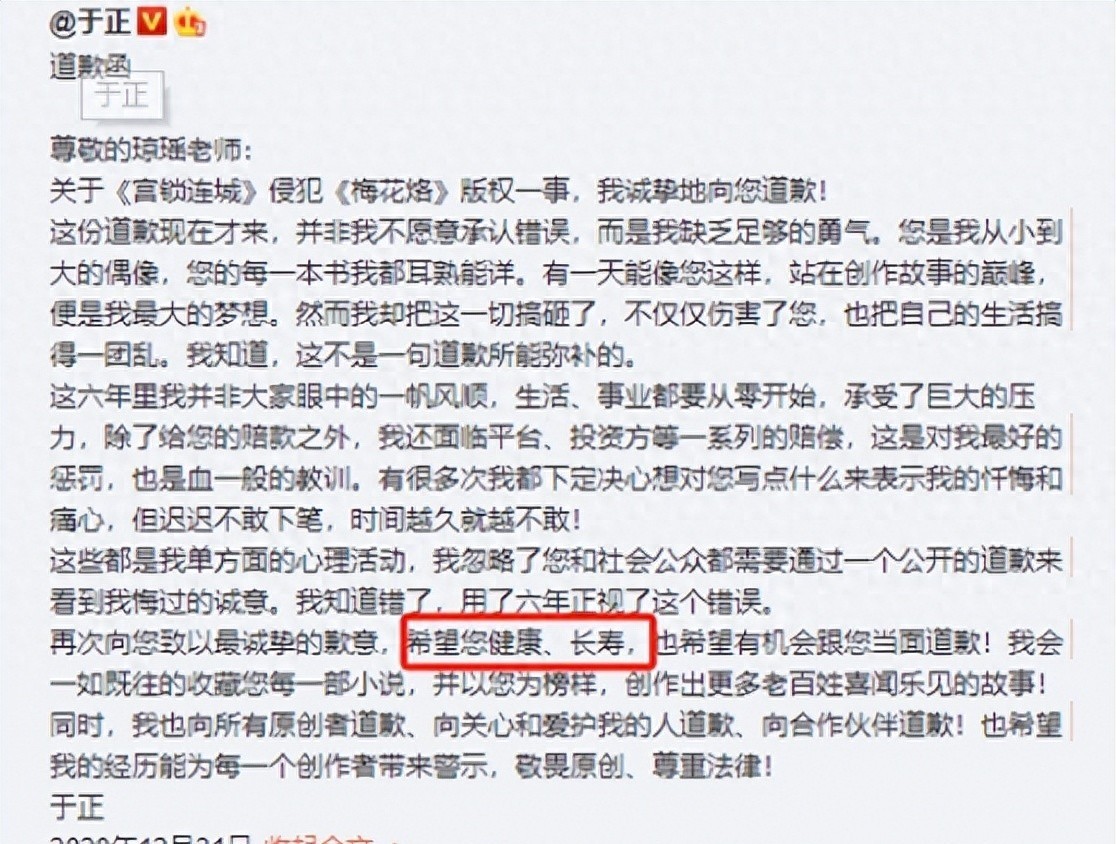 更让人捉摸不透的是,他在道歉信里还假惺惺地写希望琼瑶健康长寿。这跟他之前被曝光抄袭时那副不屑一顾、各种贬低的嘴脸一对比,再加上最近又被爆删道歉声明的事,简直太刺眼了。大家心里都在犯嘀咕,他写这话的时候,心里到底咋想的?是真的盼着琼瑶好,还是偷偷在想自己肯定比琼瑶活得久,然后这抄袭的破事就能随着时间消失不见?
