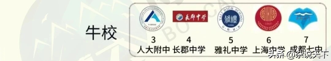 位居第二档次的“牛校”全国只有五所,分别是:中国人民大学附属中学、长郡中学、雅礼中学、上海中学、成都七中。在西南地区闻名遐迩的成都七中排在第七,着实有些令人意外。
