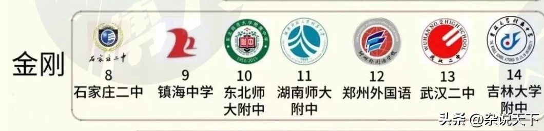 第三档次是“金刚”,全国共有七所中学入选其中,分别是:石家庄二中、镇海中学、东北师大附中、湖南师大附中、郑州外国语学校、武汉二中以及吉林大学附属中学。