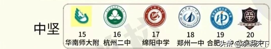 第四档次是“中坚”,共六所,分别是:华南师大附中、杭州二中、绵阳中学、郑州一中、合肥一中、北京四中。