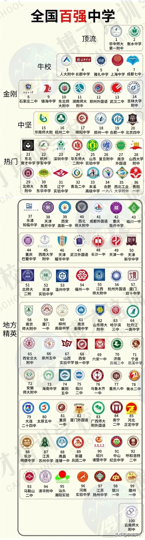 近日,某教评机构根据“学校声望”、“教学成绩”、“校园文化环境”、“对学生素质培养”、“校友资源及服务”等指标,评出了2023年全国“百强中学”榜单。出人意料的是,以前霸榜或呼声最高的人大附中、衡水中学并未占据榜首,占据榜首的却是华中师大一附。那么,2023年全国百强中学到底都有哪些学校?你就读的中学上榜了吗?一起来看看吧一一