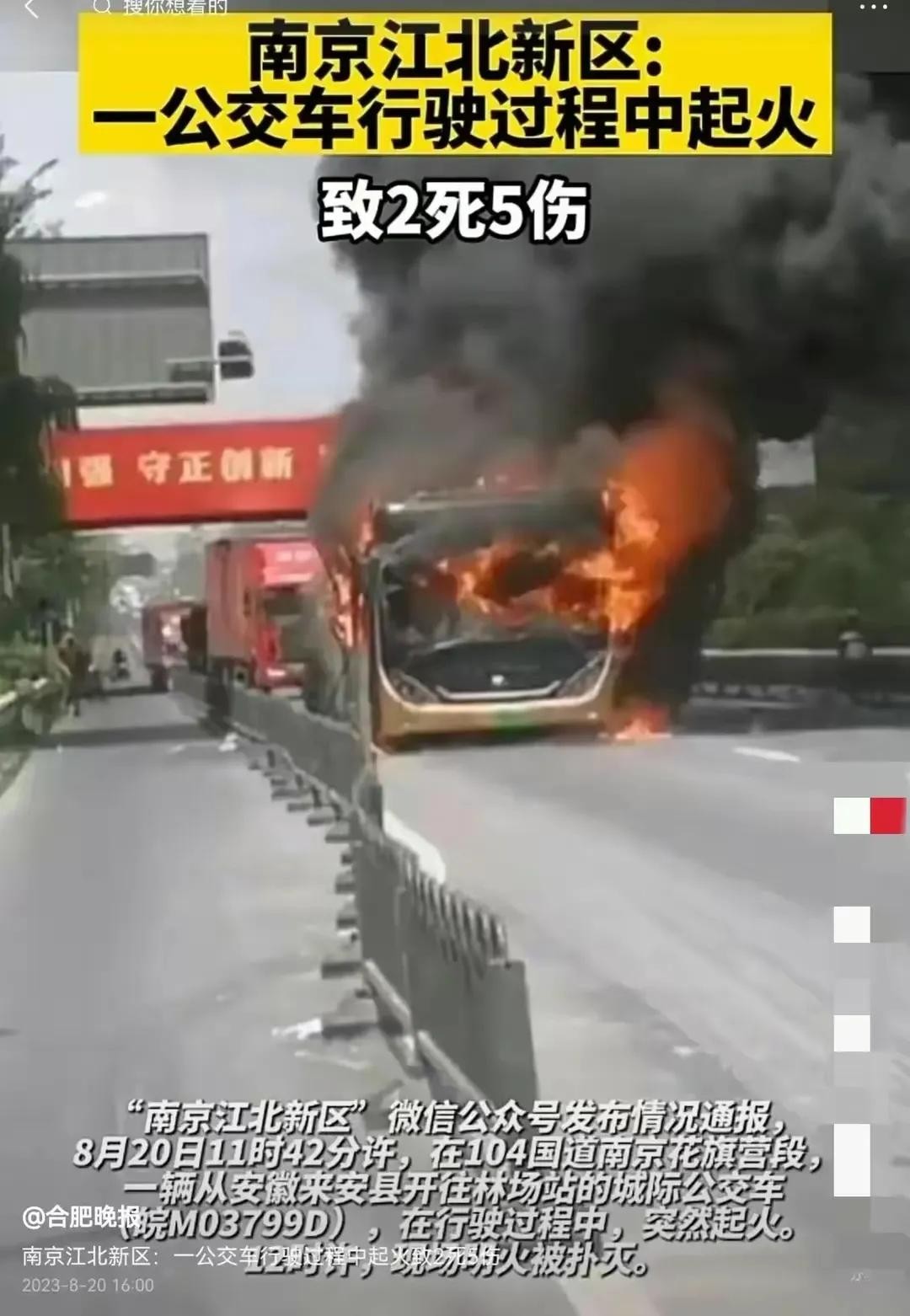 就在8月20日中午,江苏南京104国道上发生了这起惊心动魄的事故。一辆从安徽来安县开往南京林场站的长途公交车行驶至南京花旗营加油站附近时,突然冒出了浓浓的黑烟,接着火光冲天,整辆车迅速被大火吞噬。可怕的是,这场火灾导致了两人死亡,五人受伤。这一事件再次敲响了公共交通工具安全的警钟。