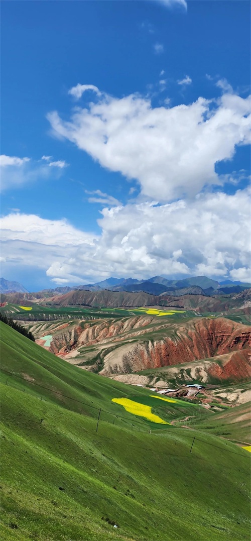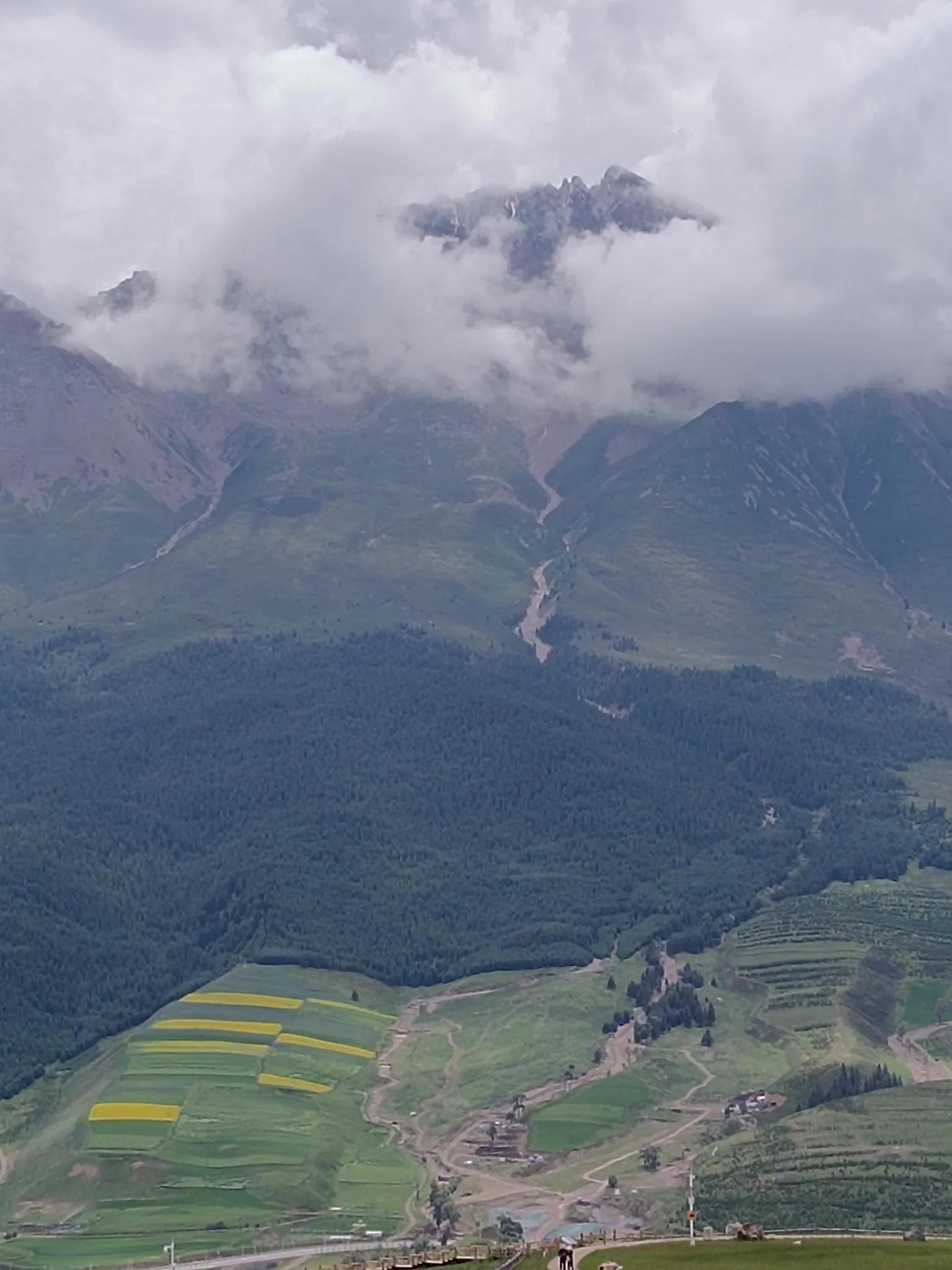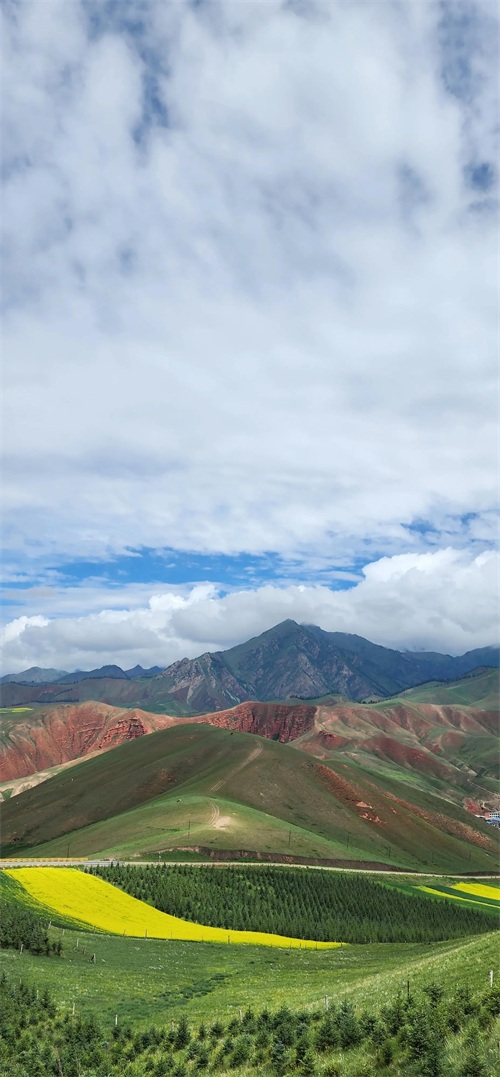 到达景区,天逐渐放晴,雨过天晴景色显得格外绚丽,卓尔山--几乎集所有美景于一体。近处的高山草甸,中远距离绿黄相间的油菜花海和青稞麦田,远处的森林和丹霞地貌,极远处在云间时隐时现的雪峰,构成的画面美不胜收。