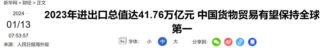 虽然对美国的出口减少,但在全球层面上,中国2023年的“进出口总值”超过41万亿