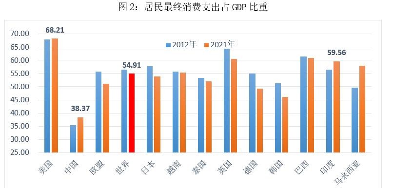 中国人的消费力,与“国家发展水平”和“强大的制造业水平”并不匹配,根据2022年的数据,中国居民消费总额46万亿,在GDP中占比仅为38.37%
