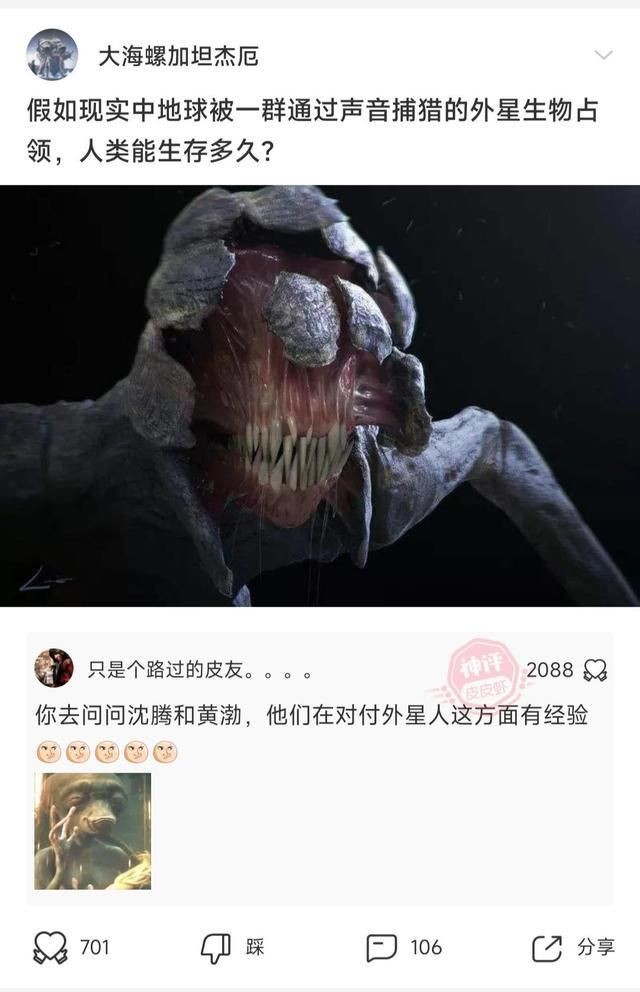 网友:你去问问沈腾和和黄渤,他们在对付外星人方面有经验。