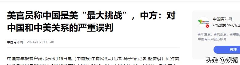 中国青年网所发布《美官员称中国是美“最大挑战”,中方:对中国和中美关系的严重误判》