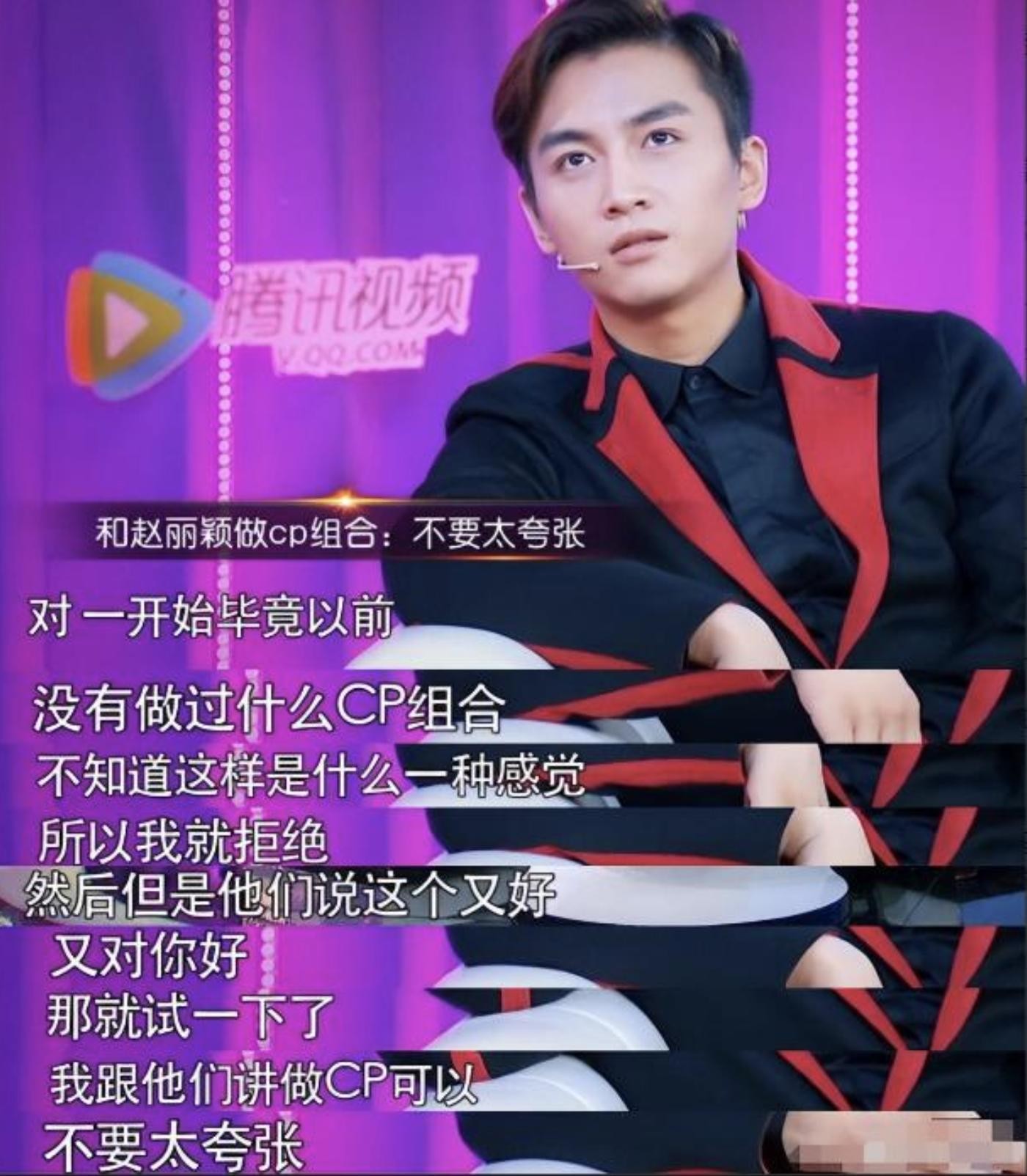 他说自己最初是拒绝和赵丽颖炒CP的,但是经不住工作人员的不断劝说,于是就答应试一试,但是不能“太夸张”。
